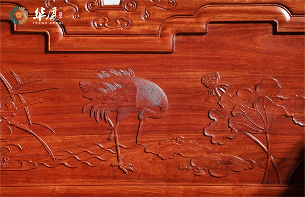 背板上仙鶴與荷花荷葉圖精雕細琢,三彎腿足部優(yōu)雅盤旋,落于托泥,于沉穩(wěn)中見靈動。