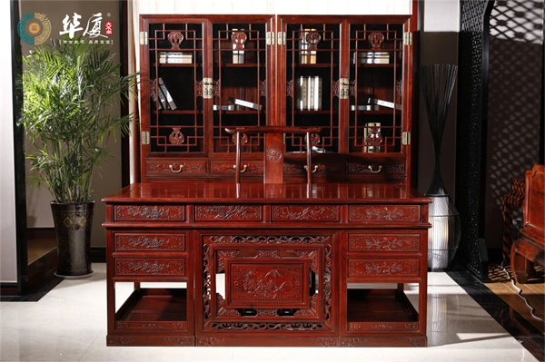 一方紅酸枝《山水書桌》,木質堅重,紋理細膩如行云流水。它造型方正大氣,比例協(xié)調;桌身之上,深浮雕與透雕技法雕琢出花鳥紋樣,將山水自然意境與手工匠藝深度融合。
