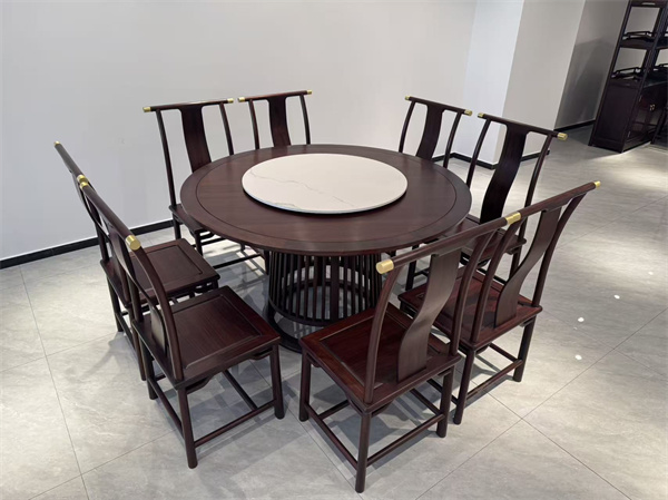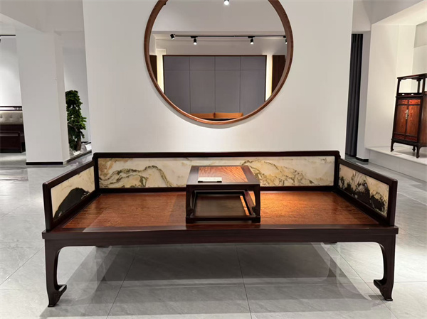 這一系列家具簡約而不簡單。匠人們創(chuàng)造性地將大果紫檀和紅酸枝兩種名貴紅木進(jìn)行深淺搭配;在沙發(fā)與床的設(shè)計中注重軟裝與木頭的和諧結(jié)合;羅漢床與圓桌則巧妙融入大理石元素。這些創(chuàng)新設(shè)計,既保留了紅木的溫潤質(zhì)感,又增添了現(xiàn)代生活的舒適度。