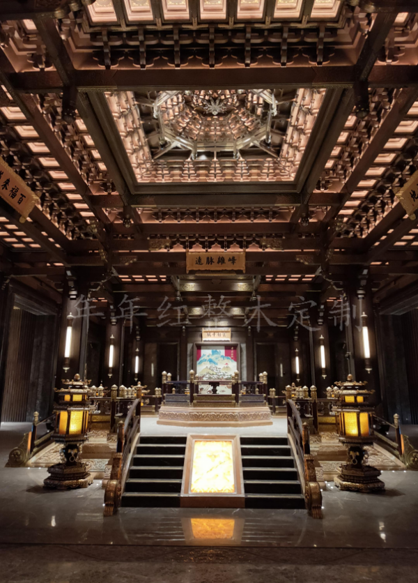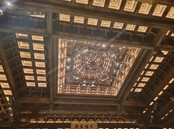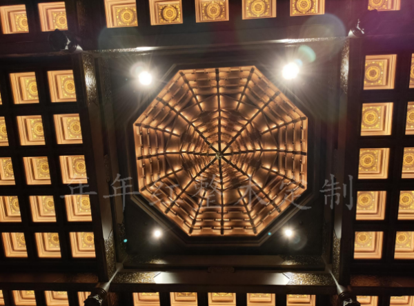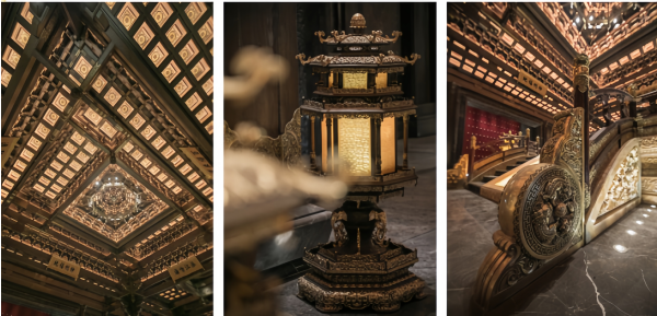 藻井華章,光影敘事:吊頂嚴格按皇家宮殿中式藻井制式設計,結構繁復精巧,不僅承載著中國古建筑中“天人合一”的哲學觀念,更成為空間的精神穹頂。這一木作杰作,配合榮獲2023年亞洲照明設計獎的照明系統(tǒng),使得光線在藻井的層層格柵與雕花間流轉傾瀉,營造出莊嚴、神秘而又溫暖的光影氛圍,讓現(xiàn)代照明科技與傳統(tǒng)木結構之美相得益彰。