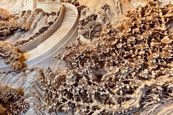 雕梁畫棟,壁藏山河:內部裝修極為講究,定制了大型木雕壁掛與立體木雕畫。墻面巨幅漆器畫與木雕作品相映成趣,講述著閩越之地的歷史傳說與風土人情。珍稀紅木材質與精湛雕刻工藝,每一刀一刻,皆是對傳統(tǒng)的堅守。力求紋理連貫、畫面完整,展現(xiàn)木材天然之美與人工雕琢之精的完美融合。