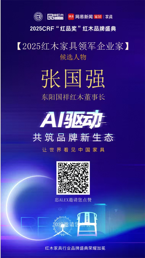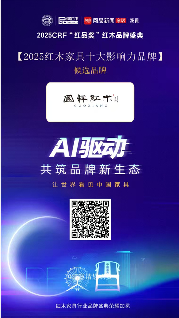 在此次評選中,國祥紅木董事長張國強入圍【2025紅木家具領(lǐng)軍企業(yè)家】候選人,國祥紅木提名【2025紅木家具十大影響力品牌】【2025大果紫檀家具熱門品牌】。2025年12月6日至11日,點贊通道正式開啟,期待您點贊支持,轉(zhuǎn)發(fā)助力,共同見證國祥紅木的品牌實力!