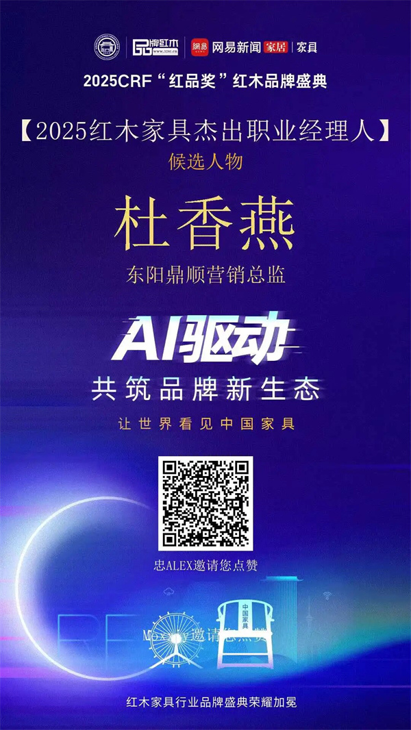 董事長蔣國順提名“2025紅木家具風(fēng)云企業(yè)家”,營銷總監(jiān)杜香燕提名“2025紅木家具杰出職業(yè)經(jīng)理人”,鼎順紅木同時(shí)提名“2025紅木家具十大受歡迎品牌”和“2025絨毛黃檀家具熱門品牌”,每一份提名背后,都是鼎順人對紅木文化的傳承與創(chuàng)新。