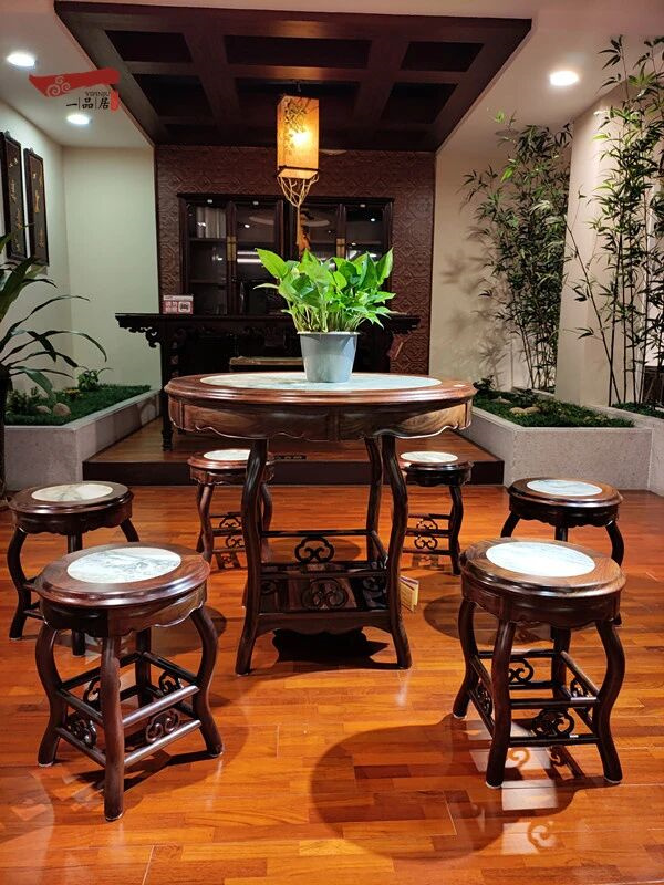 臺面選用淡雅溫潤的大理石,不僅中和了大紅酸枝的厚重感,更自帶耐磨、易清潔的實用屬性,日常打理省心便捷。臺面邊緣設計為海棠式波浪曲線,柔化了木質的硬朗,讓整體造型更顯靈動。