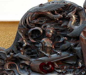 本次獲獎的大型藝術雕刻紅木家具《和諧盛世》,取材于80多棵頂級的印尼條紋烏木(即黑檀木),板壁厚度高達18公分,內容囊括巨龍騰飛、龍鳳呈祥、百鳥爭鳴、牡丹獻瑞等代表民族傳統(tǒng)文化符號的圖騰雕飾,也有仙女拜壽、文武財神、福祿壽星賜福人間的經(jīng)典故事,更有太平盛世、指點江山、錦繡江山、敦煌飛天、五谷豐登、喜樂人間的真實寫照,創(chuàng)作出富貴和諧、歡聚一堂、天上人間、人天共慶的繁榮盛世圖,喻意富貴吉祥、經(jīng)濟騰飛的太平盛世,表達出對祖國欣欣向榮的無限祝福。